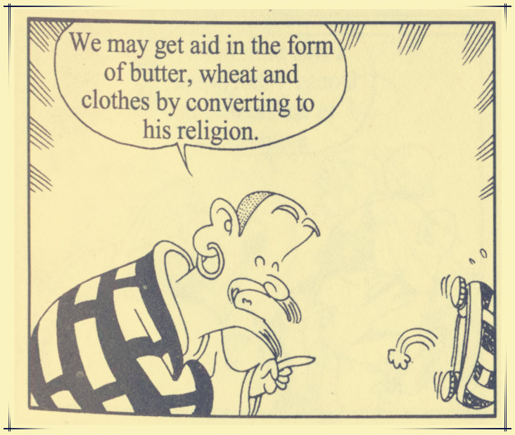 通过皈依他的宗教,我们可能得到食用油、小麦、衣服等形式的援助。
