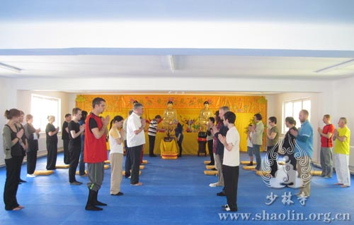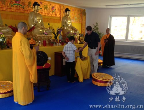 【本网讯】2012年4月28日(农历四月初八),为释迦牟尼佛诞辰日。上午十一时,奥地利少林文化中心举行了佛诞浴佛祈福法会。该中心的延良法师、延坡带领学员及信徒六十余人参加了法会。 法会过程中,每位在场人员都怀着虔诚之心,同沾法喜,共沐佛恩。法会结束后,文化中心的学员们在此神圣而特别的日子里,向对少林文化有着浓厚兴趣的人员现场展示少林功夫、少林气功、少林柔拳及禅修打坐等课程。不少人赞叹少林文化的殊胜之处,并提到少林禅修对身心的修炼很有帮助。还有人表示,“对我们来说,能在家门口学到正宗的少林功夫是一件无比荣幸的事情。”