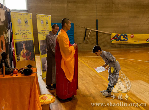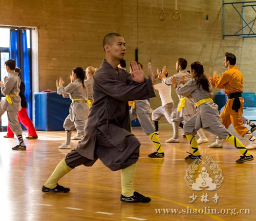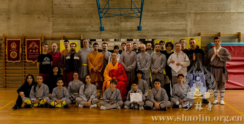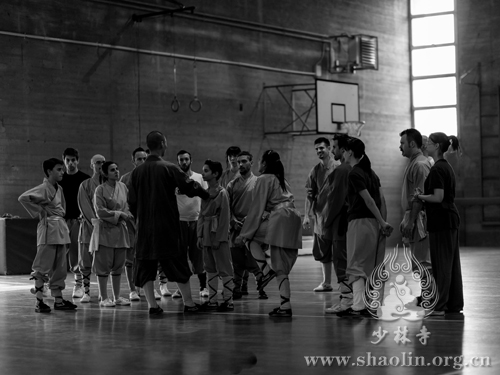 【本网讯】当地时间2016年4月6日,在意大利威尼斯少林文化中心负责人延奎的邀请下,少林寺释延提法师前往传授少林拳,并与学员们分享学习少林文化。