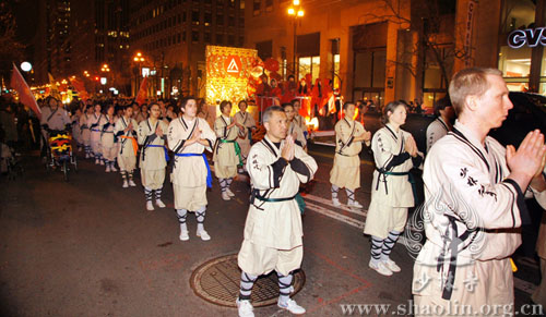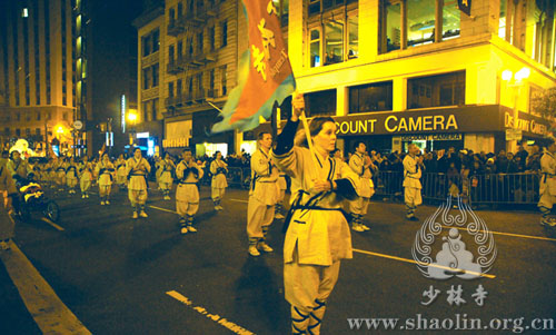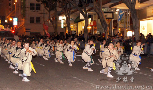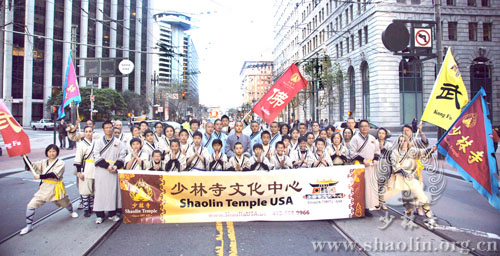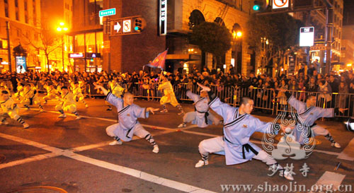 It has been over 150 years since the first big parade was held in San Francisco, USA in Chinese New Year. The Big Parade consisting of more than 100 processions that come from various regions of USA is ranked as one of the biggest parade in the world. On February 23, 2013 (local time of San Francisco), dozens of students with different ages and different colors of skin from Shaolin Temple of San Francisco, Fremont Shaolin Temple of Silicon Valley, California and Shaolin Kungfu Class of the Medical College of Stanford University which is affiliated with Shaolin Temple USA led by their masters were invited to participate in the annual cultural gala to show splendid Shaolin Kungfu to millions of field audience, global television and cyber citizens.