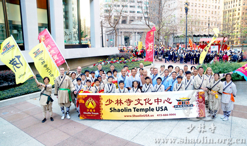 (March 7, 2105, San Francisco)Basked in the sun's golden rays in a spring afternoon, world economic, cultural and tourism epicenter San Francisco hosted its one-and-half-century old cultural extravaganza — the annual Chinese New Year Parade. Shaolin Temple USA joined 140 parade teams from all over the United States in jubilant celebration of the Year of the Golden Ram.
