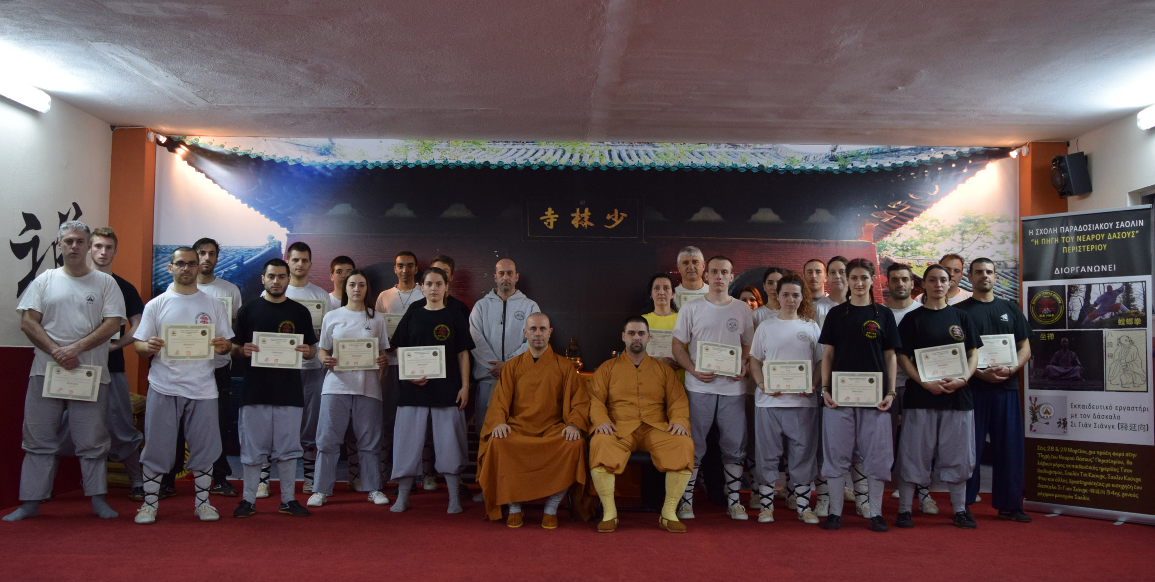 On Saturday and Sunday,March 28 & 29,2015, Master Shi Yan Xiang,founder of Shaolin Temple Athens,organized a weekend workshop about Shaolin culture at Alexopoulos Nikos center. Master Yan Xiang taught Shaolin Chan meditation, Shaolin sitted Ba Duan Jin, and the traditional form of Shaolin Mei Hua Tang Lang Quan.