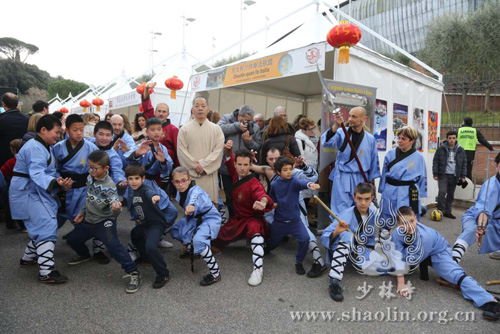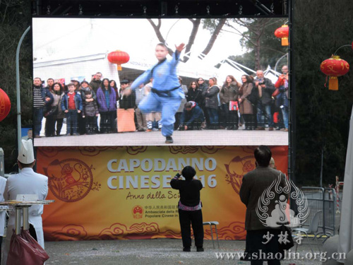 On the afternoon of January 30, the 2016 New Year's Celebration was grandly held by Chinese Embassy in Italy at the Auditorium Parco Della Musica. Led by head of Italy Shaolin Fist Union Master Yan Hui, Shaolin disciples of the union were invited to attended the celebration.