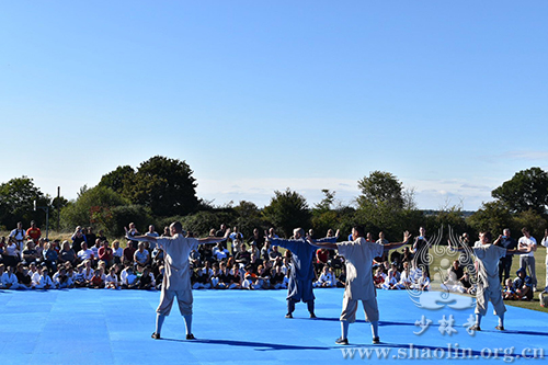 There were three lessons that day. The first class was a children course participated by over seventy children. Master Yanxiu taught them Shaolin basic training and boxing. At the end Master Yanxiu taught them meditation practice and how to sit in meditation as well as Shaolin cultural knowledge, etc. After the first lession, Master Yanxiu together with his disciples demonstrated Shaolin Group Boxing, traditional boxing, pictographic boxing (xiangxingquan), Shaolin weapons, etc.