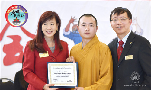 The Representative of California, Fremont city mayor Lily Mei and the councilor of Saratoga Zhao Yan delivered speeches respectively and issued the certificate of recognition. They thanked Master Yanran for bring Shaolin Kungfu and profound Shaolin culture to the United States and encouraged participants to make still further progress.