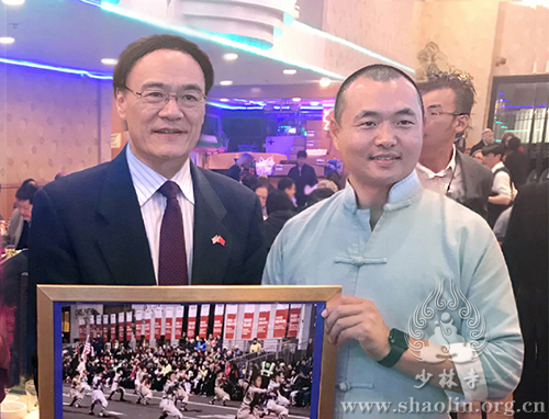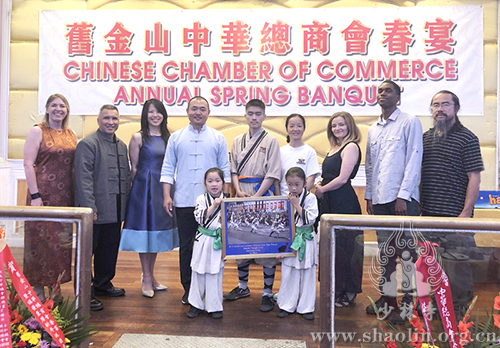(San Francisco, USA) Shaolin Temple USA’s 50-member “Shaolin Damo Straight Sword” parade team led by Executive Director Master Yanran won the “Specialty Units” Top Award in this year’s San Francisco Chinese New Year Parade. On April 26, Executive Director Master Yanran and parade team representatives accepted the award from parade organizer San Francisco Chinese Chamber of Commerce at its annual spring banquet. This is the 8th time that Shaolin Temple USA has won an award for outstanding performance in the parade.